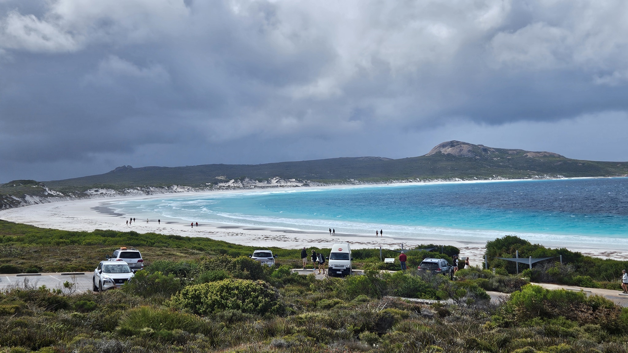 Morgens wieder Regen, aber wir fahren wie geplant in den Cape Le Grand Nationalpark, weil wir wollen unbedingt die Lucky Bay sehen, die für seinen strahlend weißen Sand und sein türkisfarbenes Wasser bekannt ist.