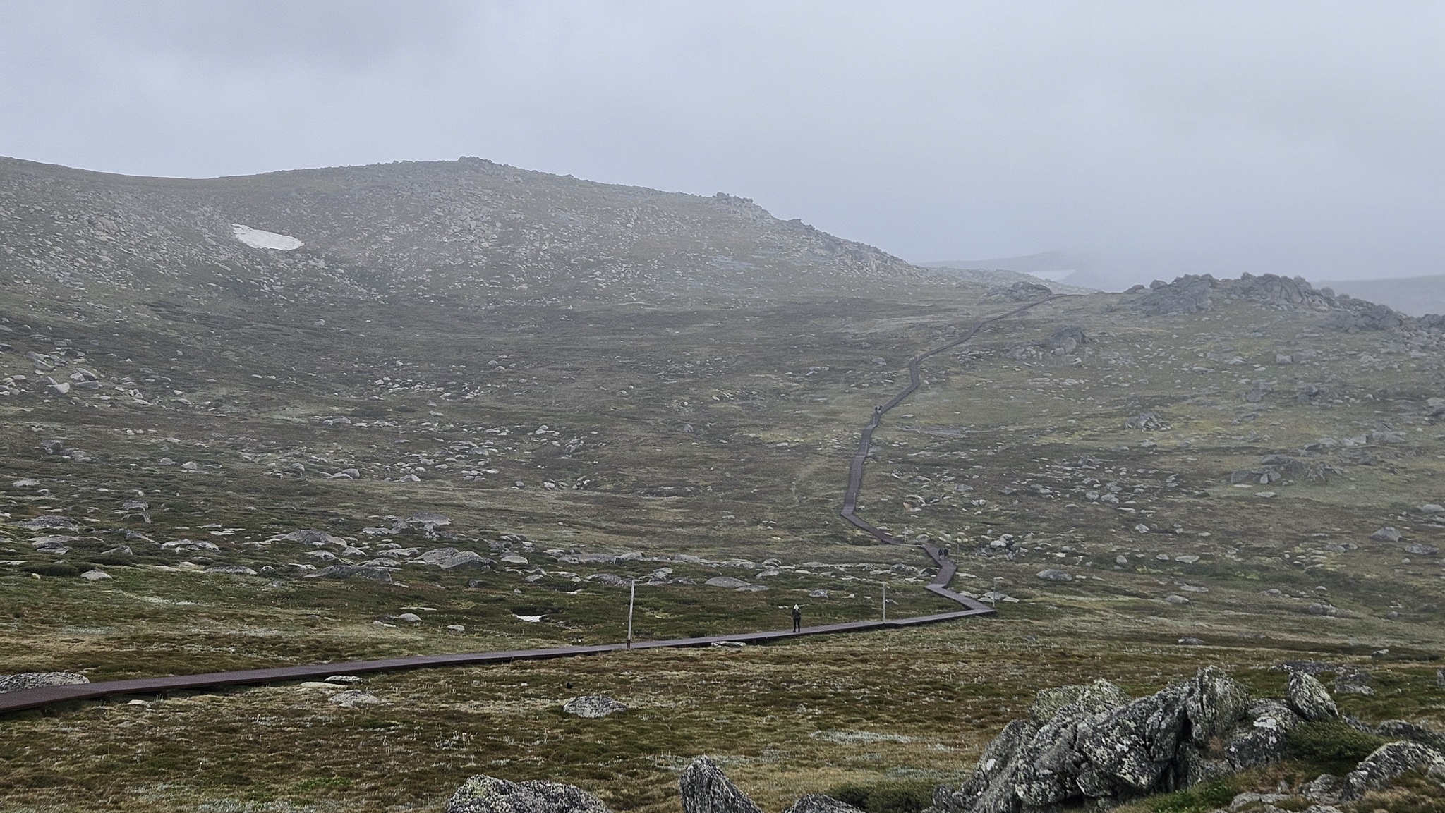 In der Früh starten wir nach Thredbo zum Nationalpark. Das Wetter ist trübe und es nieselt ganz leicht. Trotzdem machen wir uns auf den Weg mit dem Sessellift hinauf zum "Eagles Nest", wo der 13 km (hin und retour) lange Wanderweg zum höchsten Gipfel Australiens (2228m) startet. Leider wird der Regen und Nebel immer mehr und nimmt uns jegliche schöne Aussicht. Der Weg ist durchgehend auf Metallgitter geführt (um die Umwelt zu schonen) und wir können uns unsere Wanderstöcke an den Hut picken.