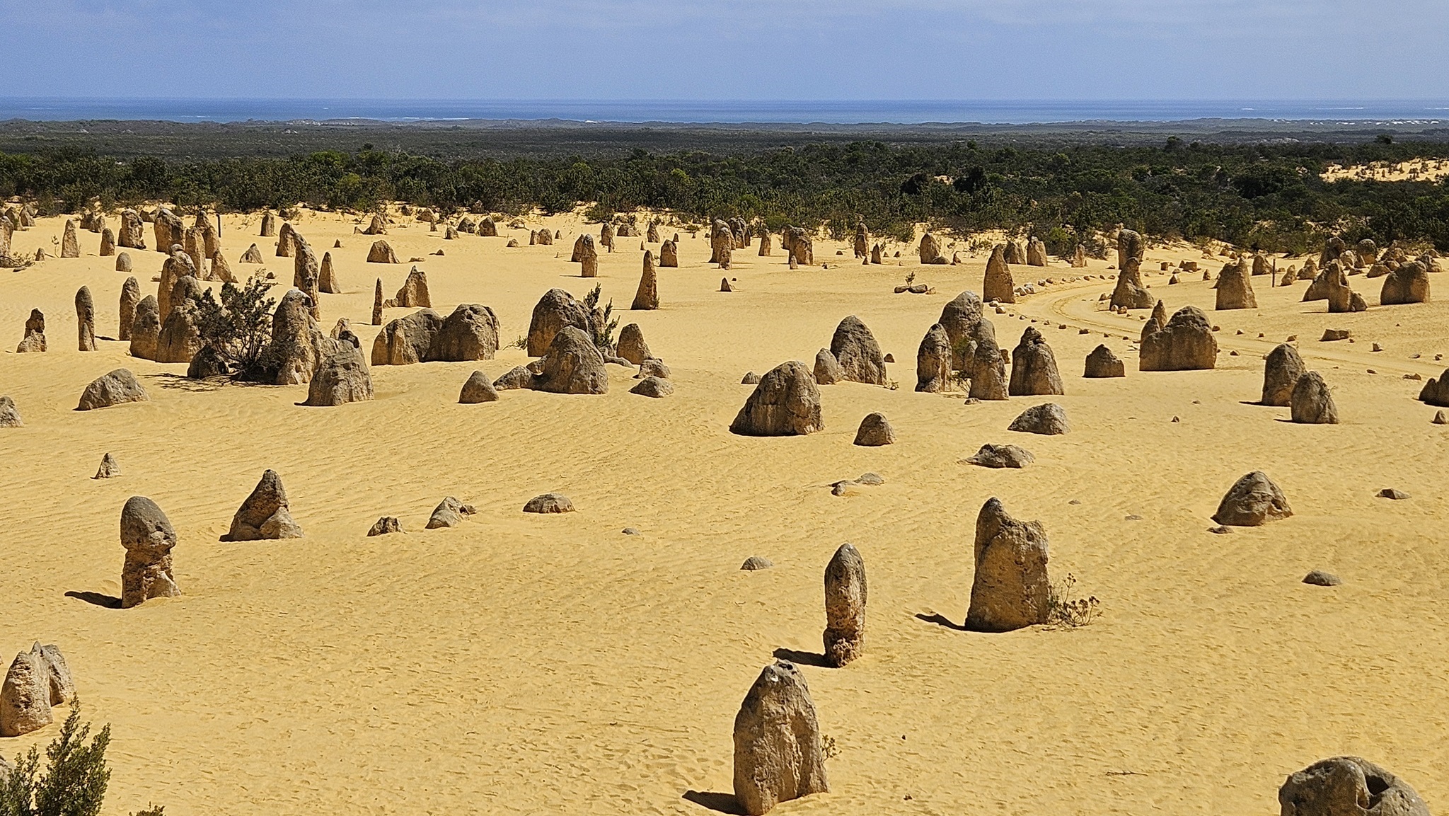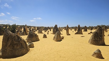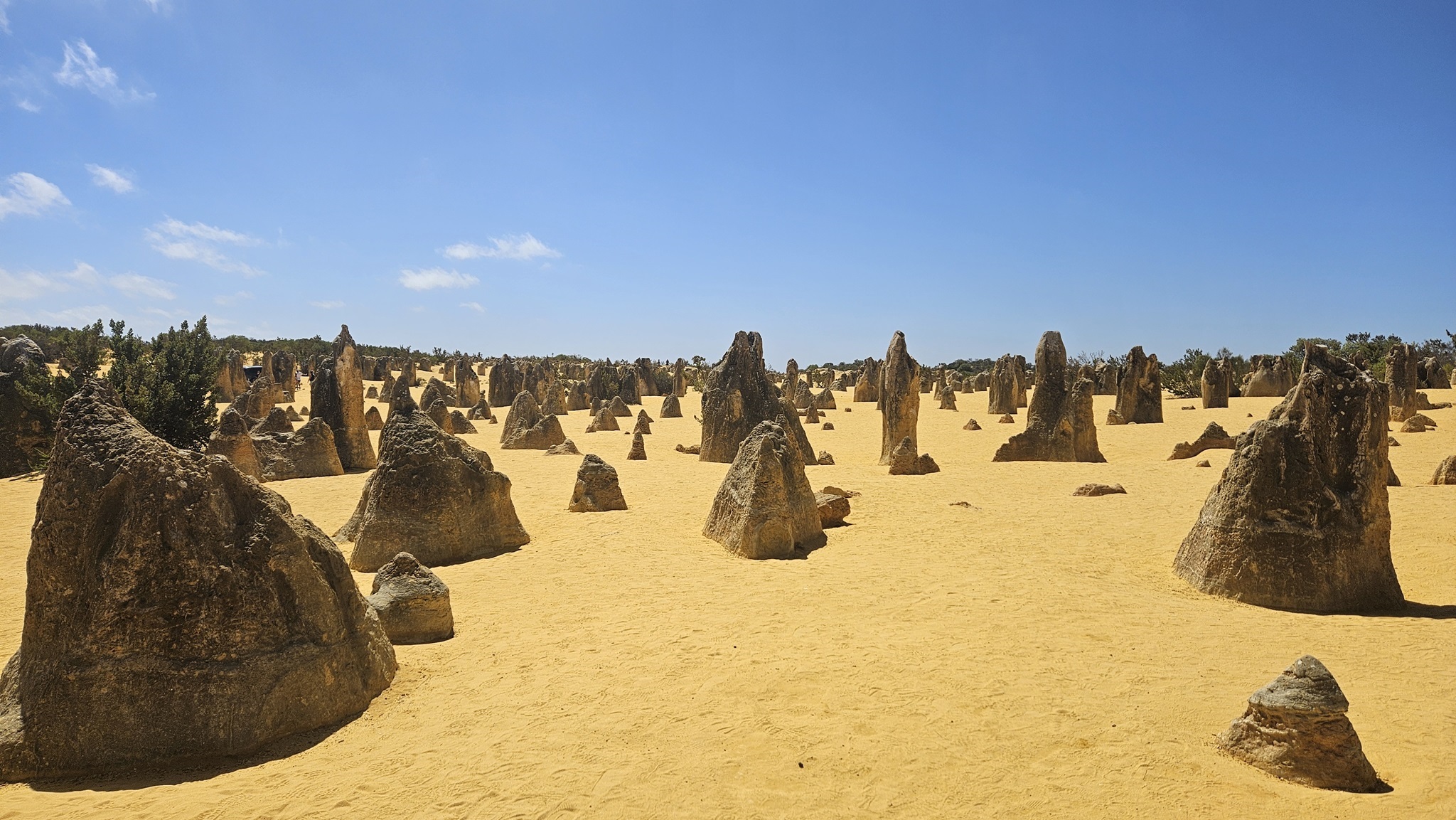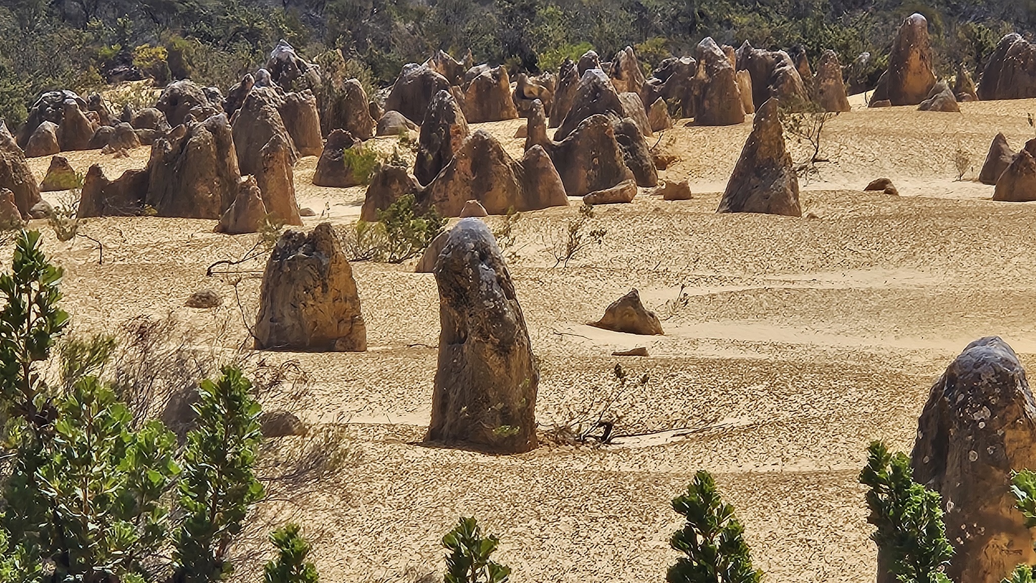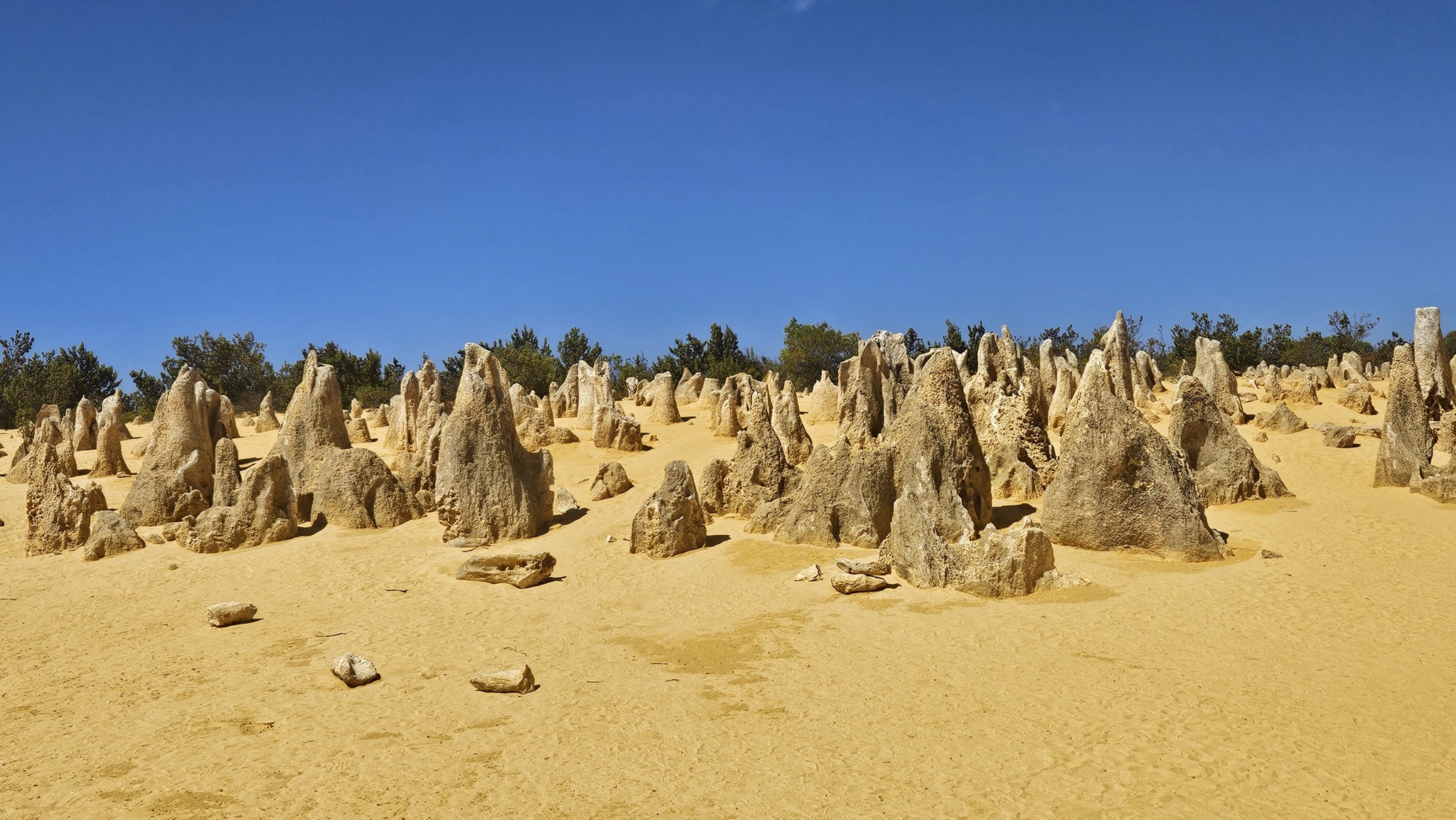 Die Pinnacles sind Kalksteinformationen im Nambung-Nationalpark in der Nähe der Stadt Cervantes. Das Gebiet ist von Tausenden verwitterter gelber Kalksteinsäulen geprägt . Einige der höchsten Felsnadeln ragen bis zu 3,5 Meter über den gelben Sandboden hinaus. Die verschiedenen Formationen umfassen solche, die deutlich höher als breit sind und Säulen ähneln, daher der Name „Felsnadeln“ , während andere nur etwa einen Meter hoch und breit sind und kleinen Grabsteinen gleichen.