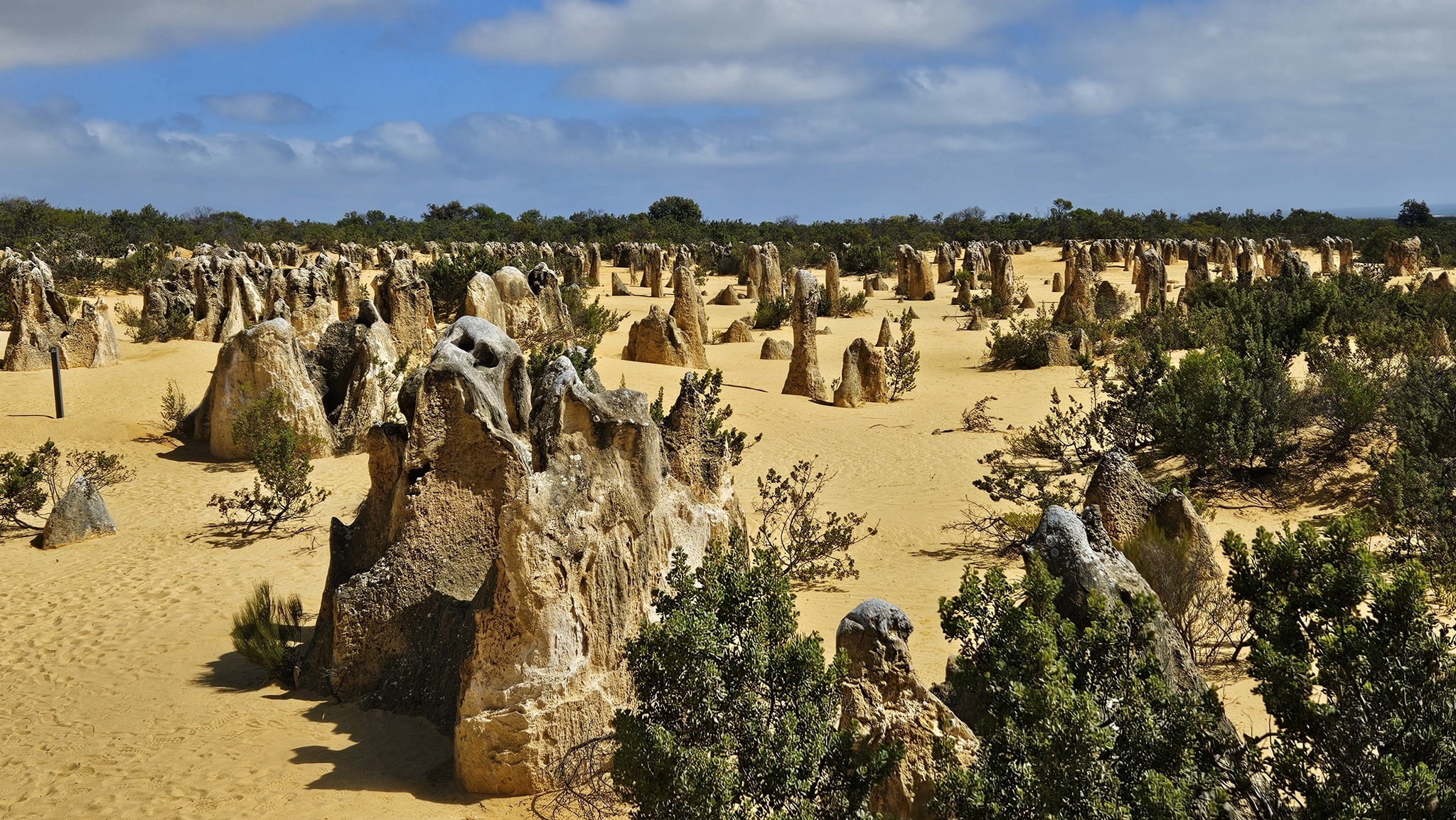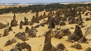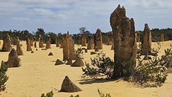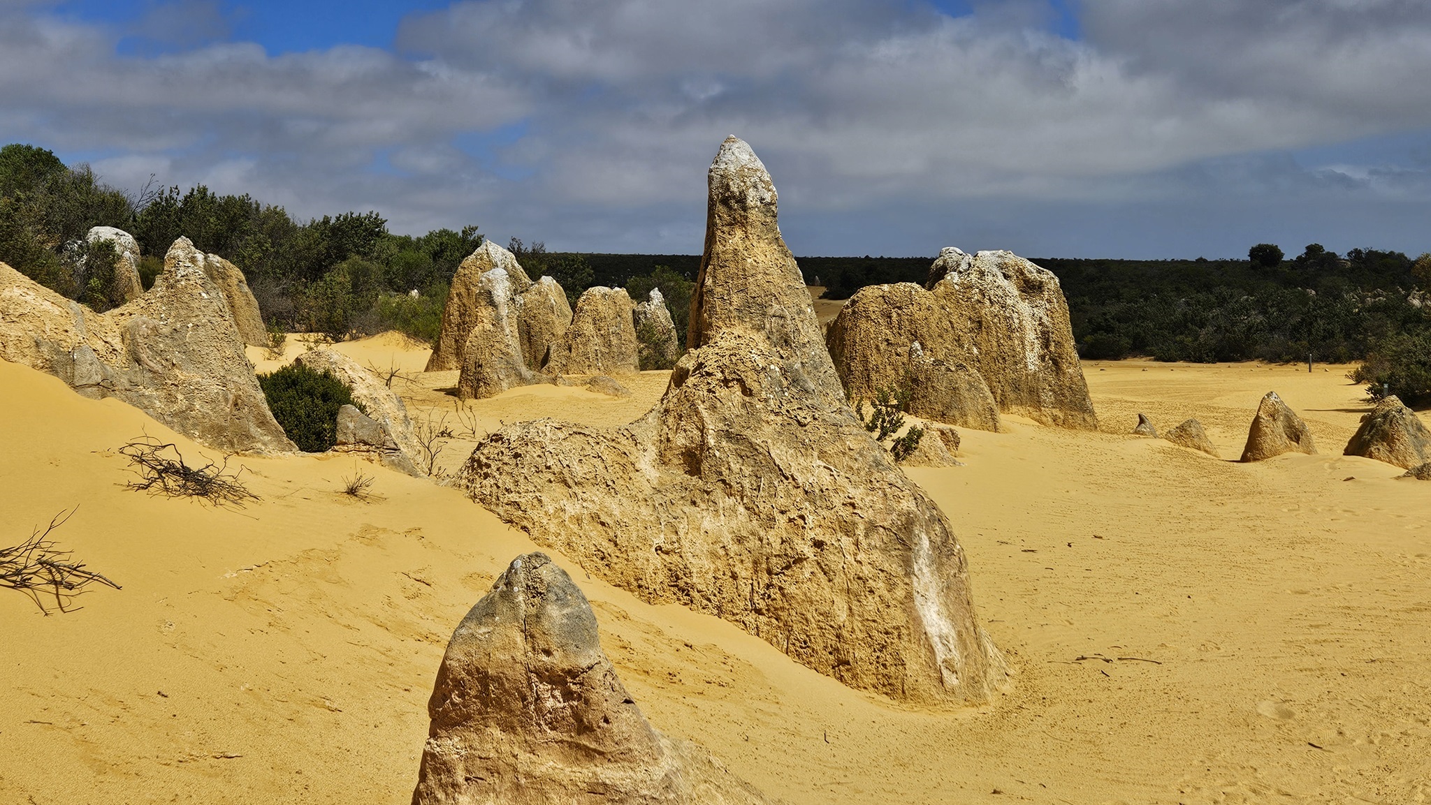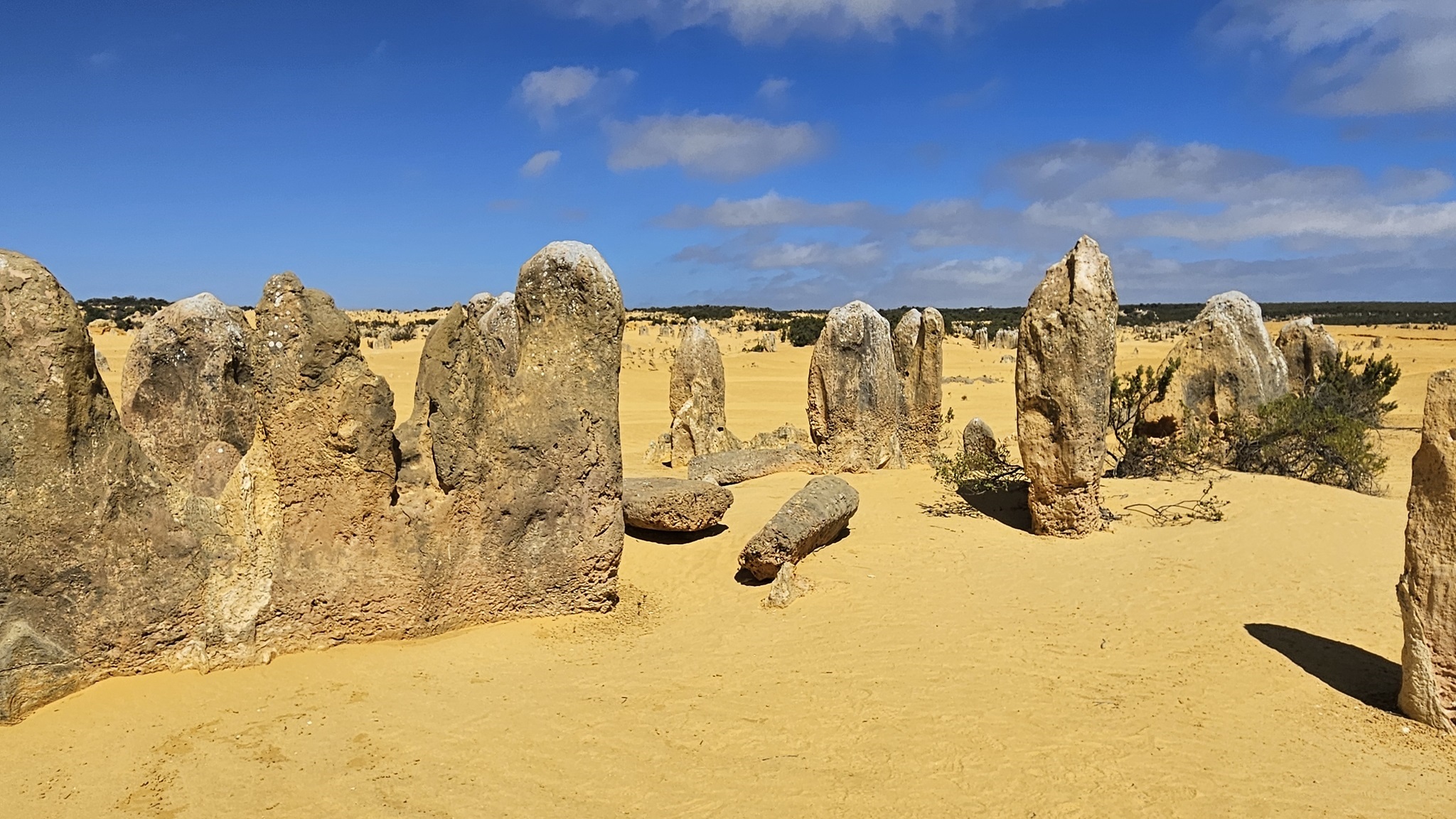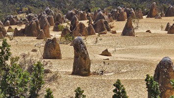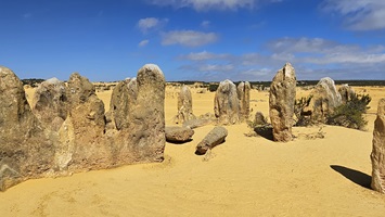 Die Pinnacles sind Kalksteinformationen im Nambung-Nationalpark in der Nähe der Stadt Cervantes. Das Gebiet ist von Tausenden verwitterter gelber Kalksteinsäulen geprägt . Einige der höchsten Felsnadeln ragen bis zu 3,5 Meter über den gelben Sandboden hinaus. Die verschiedenen Formationen umfassen solche, die deutlich höher als breit sind und Säulen ähneln, daher der Name „Felsnadeln“ , während andere nur etwa einen Meter hoch und breit sind und kleinen Grabsteinen gleichen.