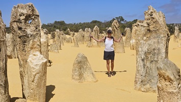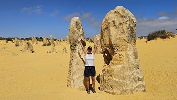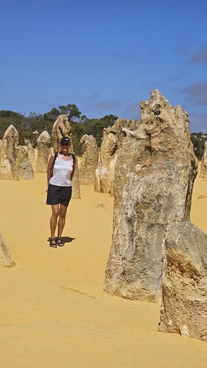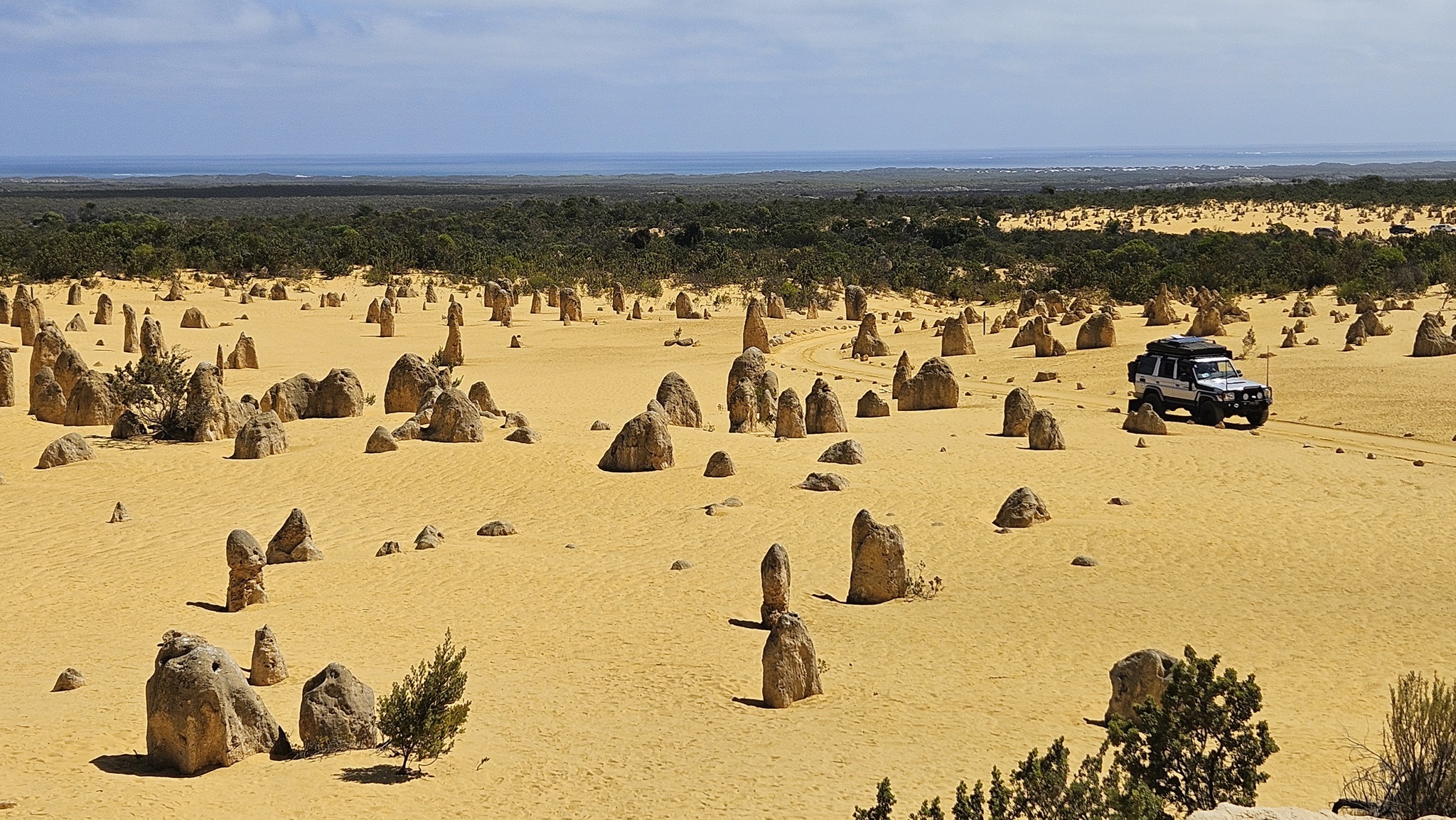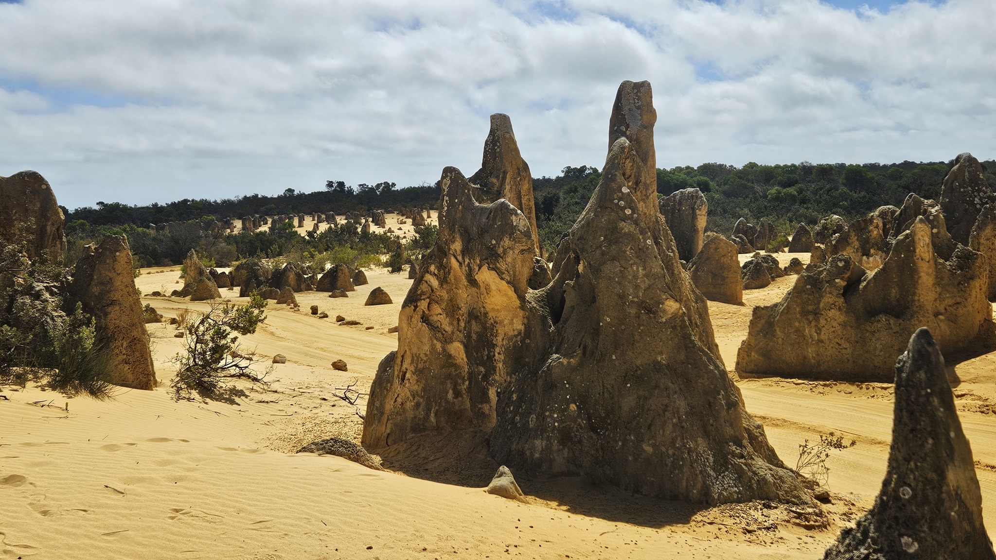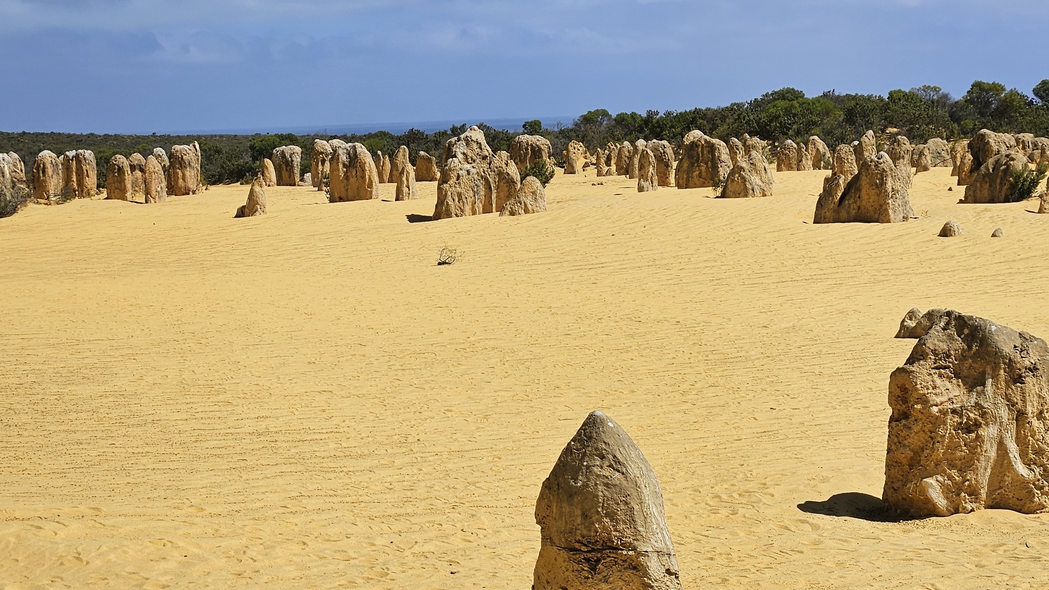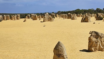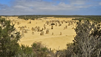 Die Pinnacles sind Kalksteinformationen im Nambung-Nationalpark in der Nähe der Stadt Cervantes. Das Gebiet ist von Tausenden verwitterter gelber Kalksteinsäulen geprägt . Einige der höchsten Felsnadeln ragen bis zu 3,5 Meter über den gelben Sandboden hinaus. Die verschiedenen Formationen umfassen solche, die deutlich höher als breit sind und Säulen ähneln, daher der Name „Felsnadeln“ , während andere nur etwa einen Meter hoch und breit sind und kleinen Grabsteinen gleichen.