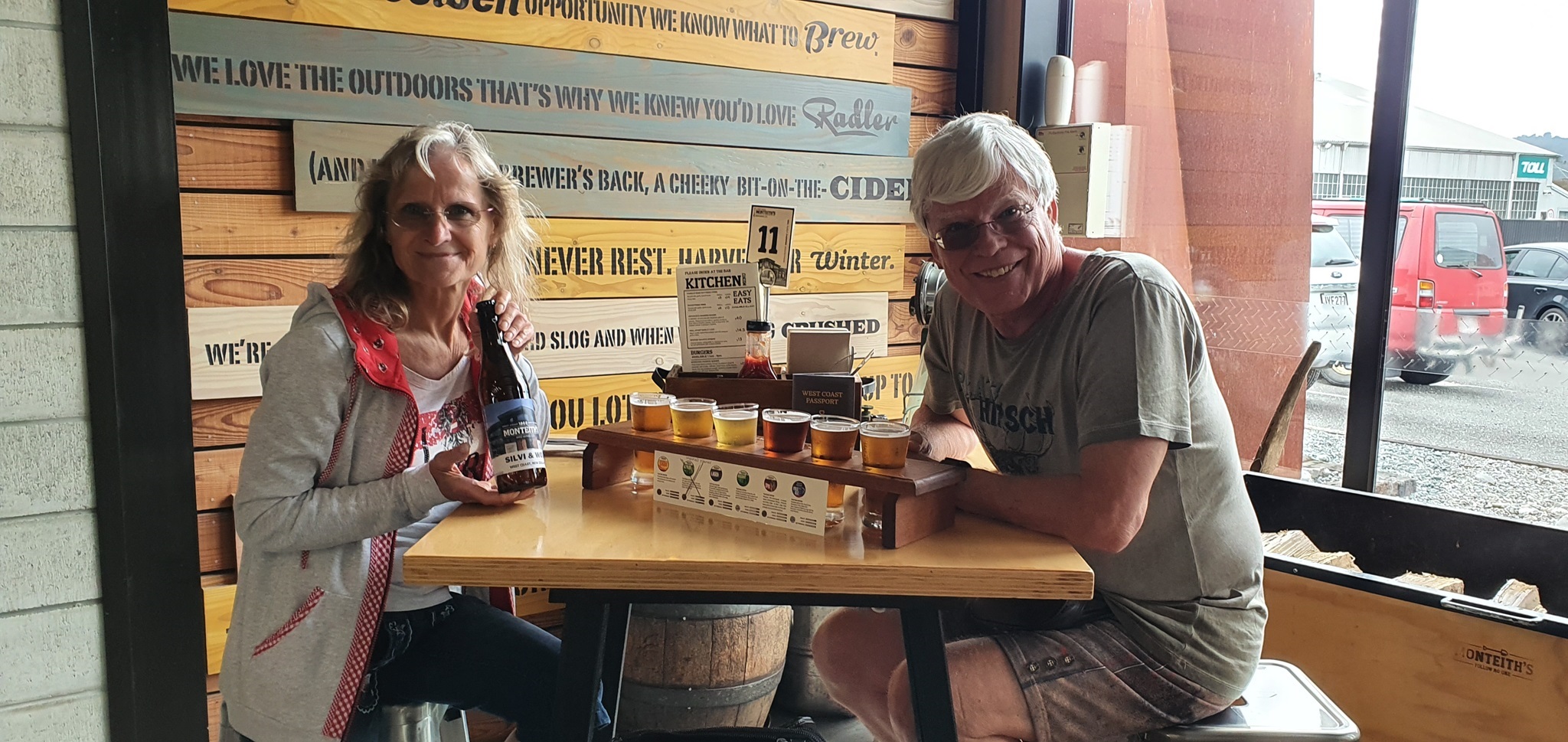 Von Hokitika brausen wir der bewegten, rauhen Küste entlang nach Greymouth. Dort angekommen ging es gleich zum wichtigsten Gebäude der Stadt, "Monteith's Brewery". Wir verkosten dort eine 6er Garnitur und verspeisen auch ein paar Rippchen dazu. Natürlich wird auch der Reiseproviant ergänzt.