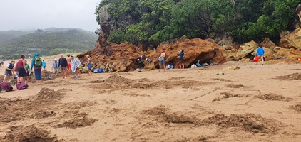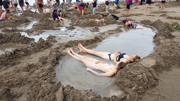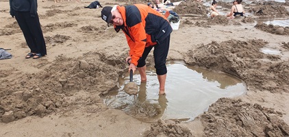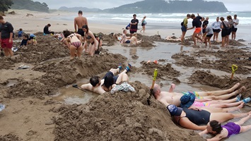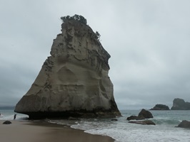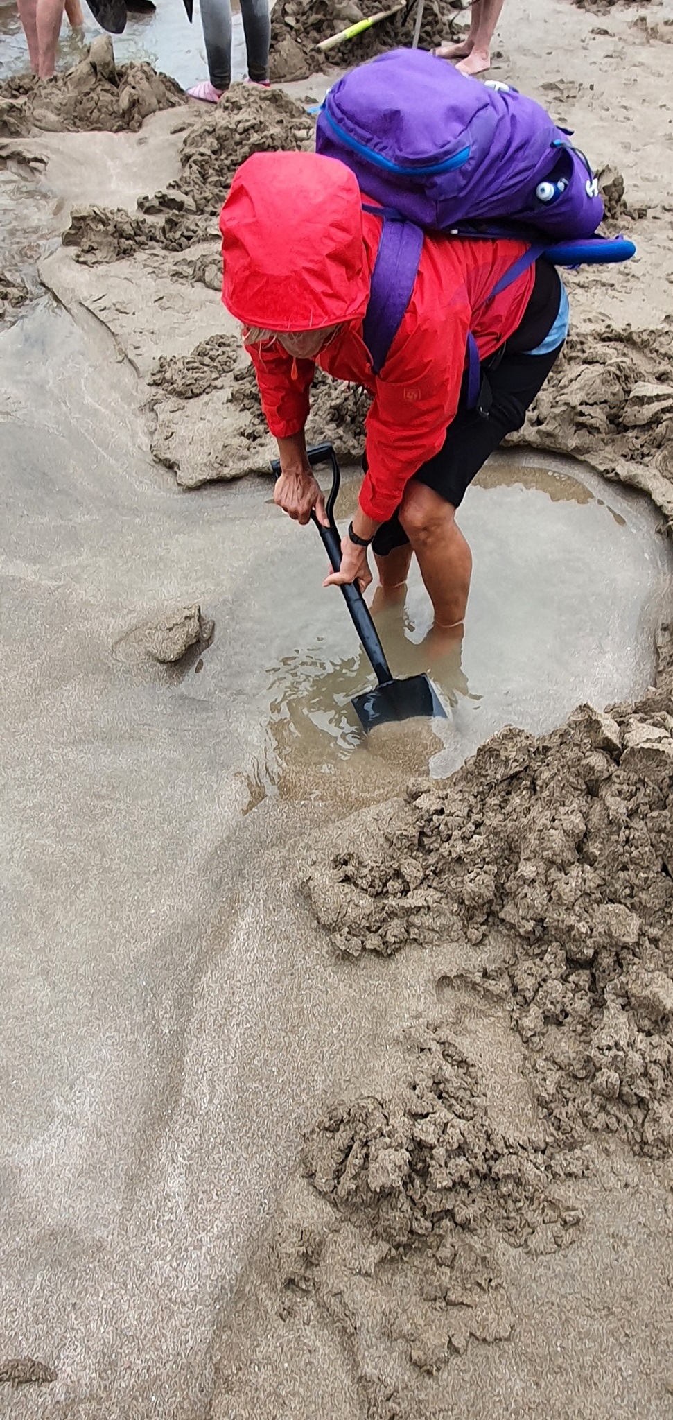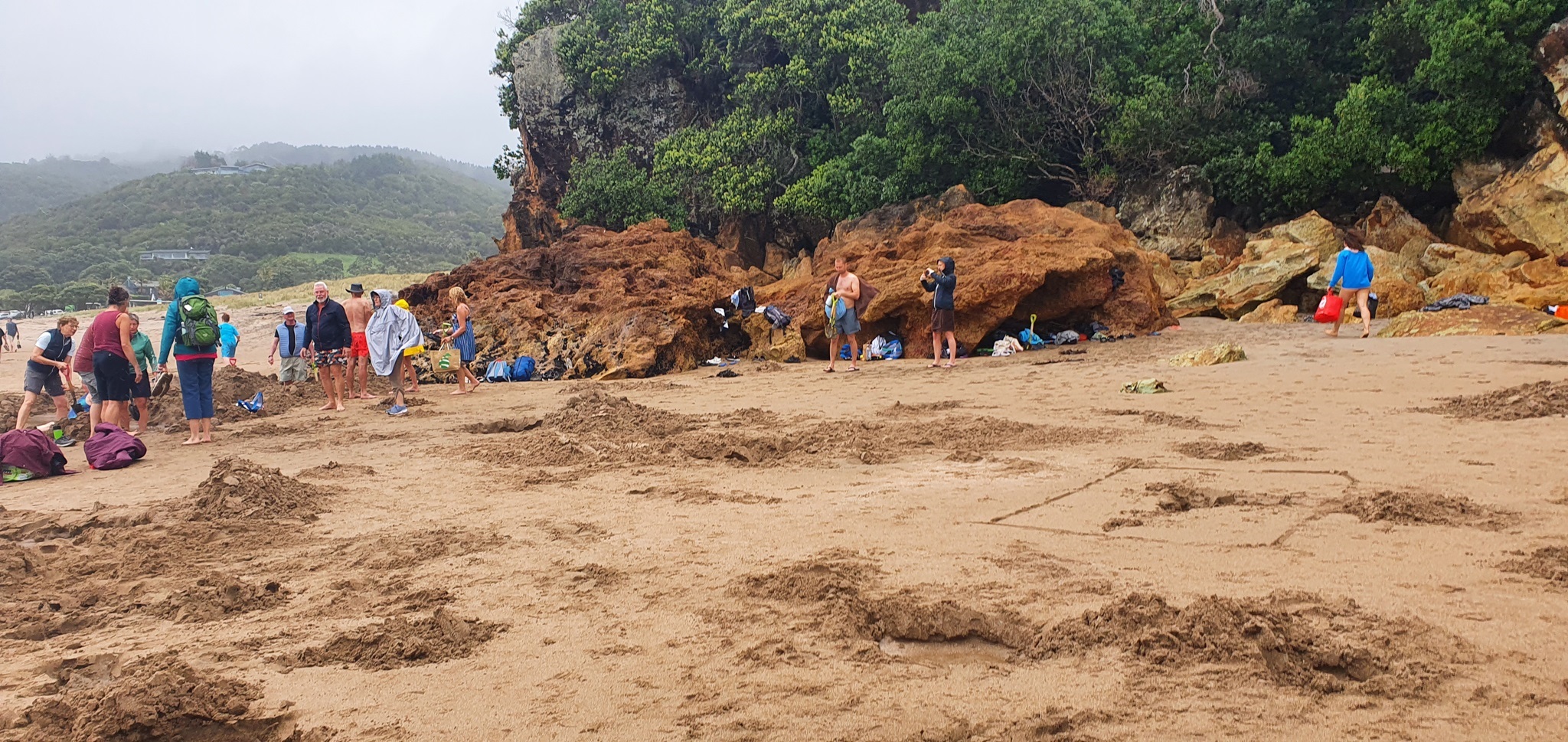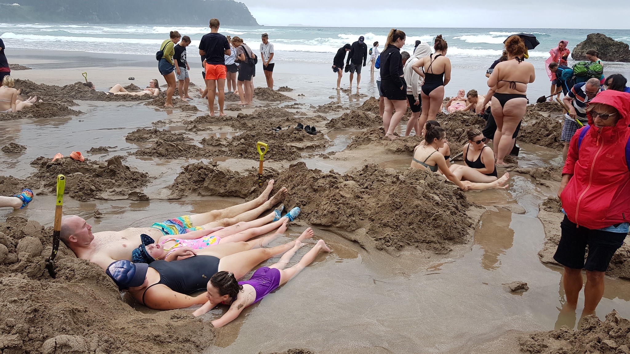 Anschließend machen wir uns auf den Weg zum Hot Water Beach. Dort kann jeder der mit einem Grabutensil ausgestattet ist, auf die Suche nach der heißen Quelle machen. Trotz des grauslichen Wetters, sulen sich viele Leute im warmen Wasser welches knapp unter der Sandoberfläche anzutreffen ist. Wir benetzen uns nur die Zehen, ans Ausziehen ist ja gar nicht zu denken.