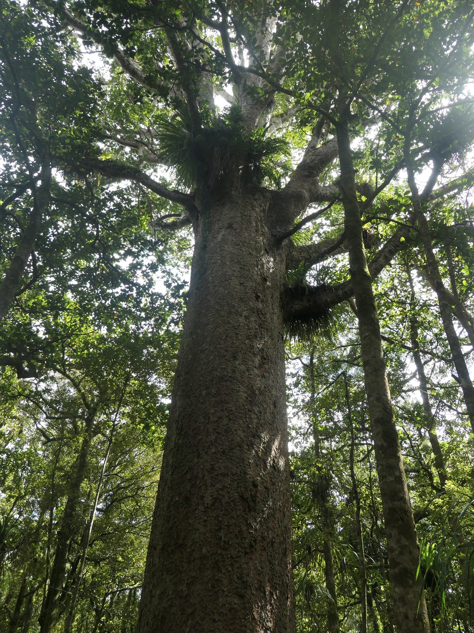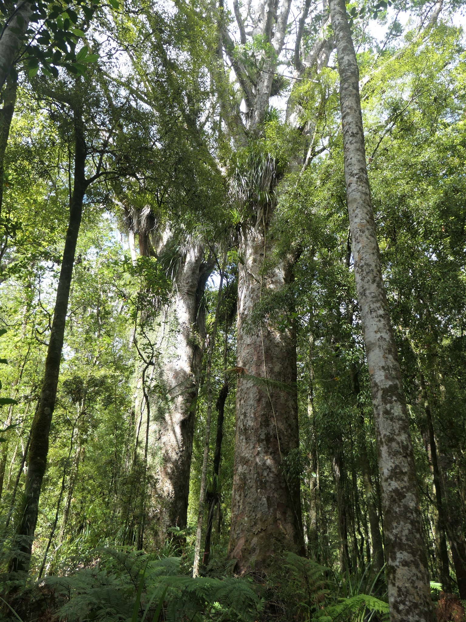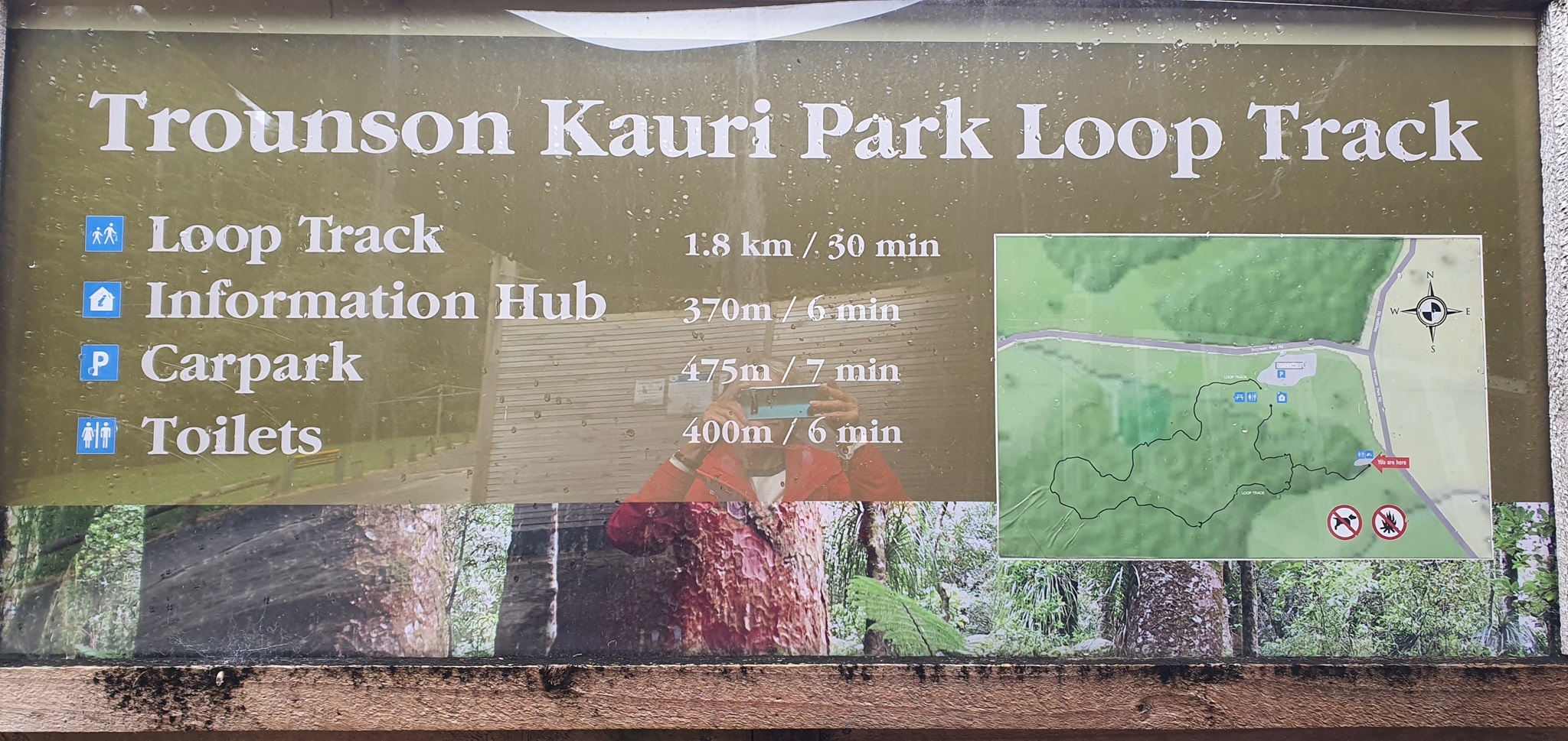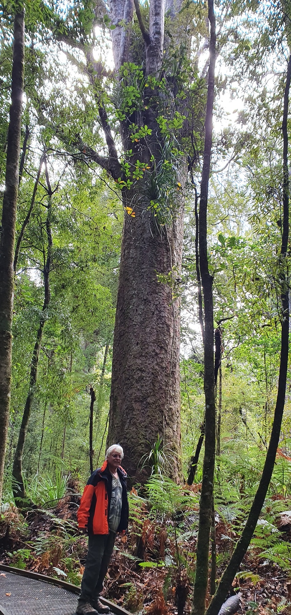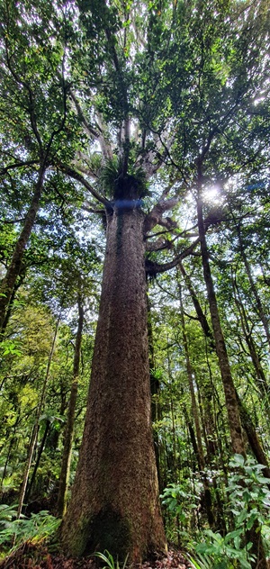 In der Nacht regnet es wieder, aber am Morgen blinzelt die Sonne wieder ein wenig durch die Regenwolken. Wir machen uns auf den Weg zum Trounson Kauri Park, dort gibt es einen Rundwanderweg, wo man einige der größten Kauri Bäume bewundern kann. Nicht so groß wie der Gestrige, aber dafür viele auf einmal.