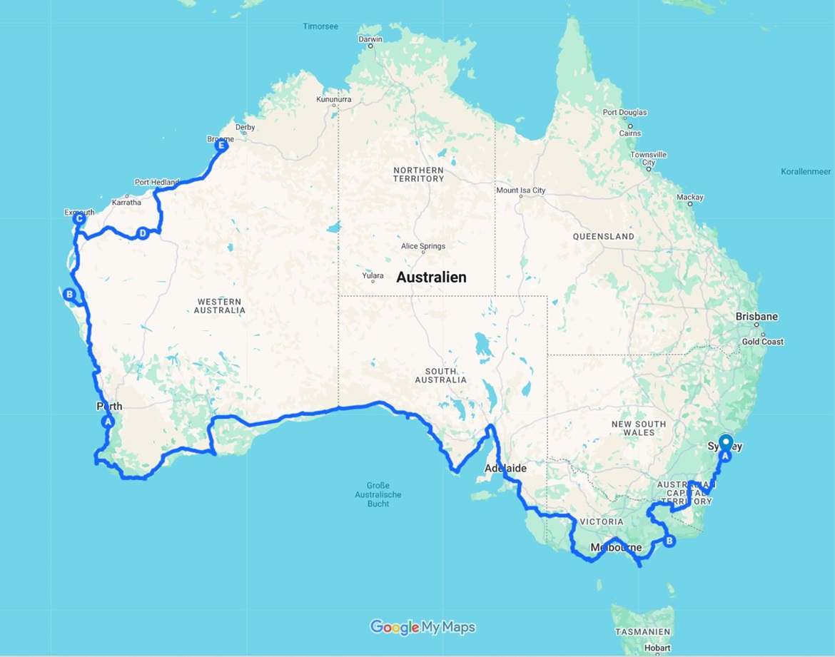 Sydney => Canberra => Melbourne => Adelaide => Nullarbor => Perth => Broome