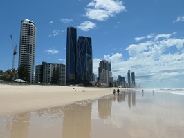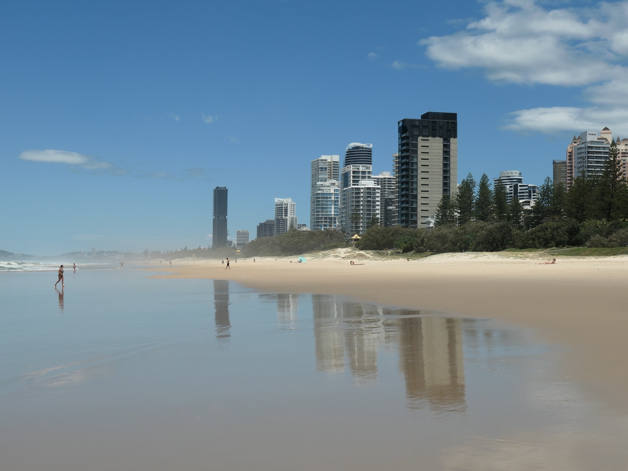 Wir sind schon ganz gespannt auf die Gold Coast. Die Gold Coast ist ein wichtiges Touristenziel mit sonnigem, subtropischem Klima und ist weithin bekannt für seine erstklassigen Surfstrände , die von Hochhäusern dominierte Skyline gefällt uns einmal gar nicht. Die Strände sind natürlich immens dimensioniert, aber Baden ist auch heute wieder durch den starken Wind verboten.