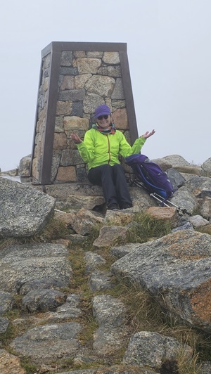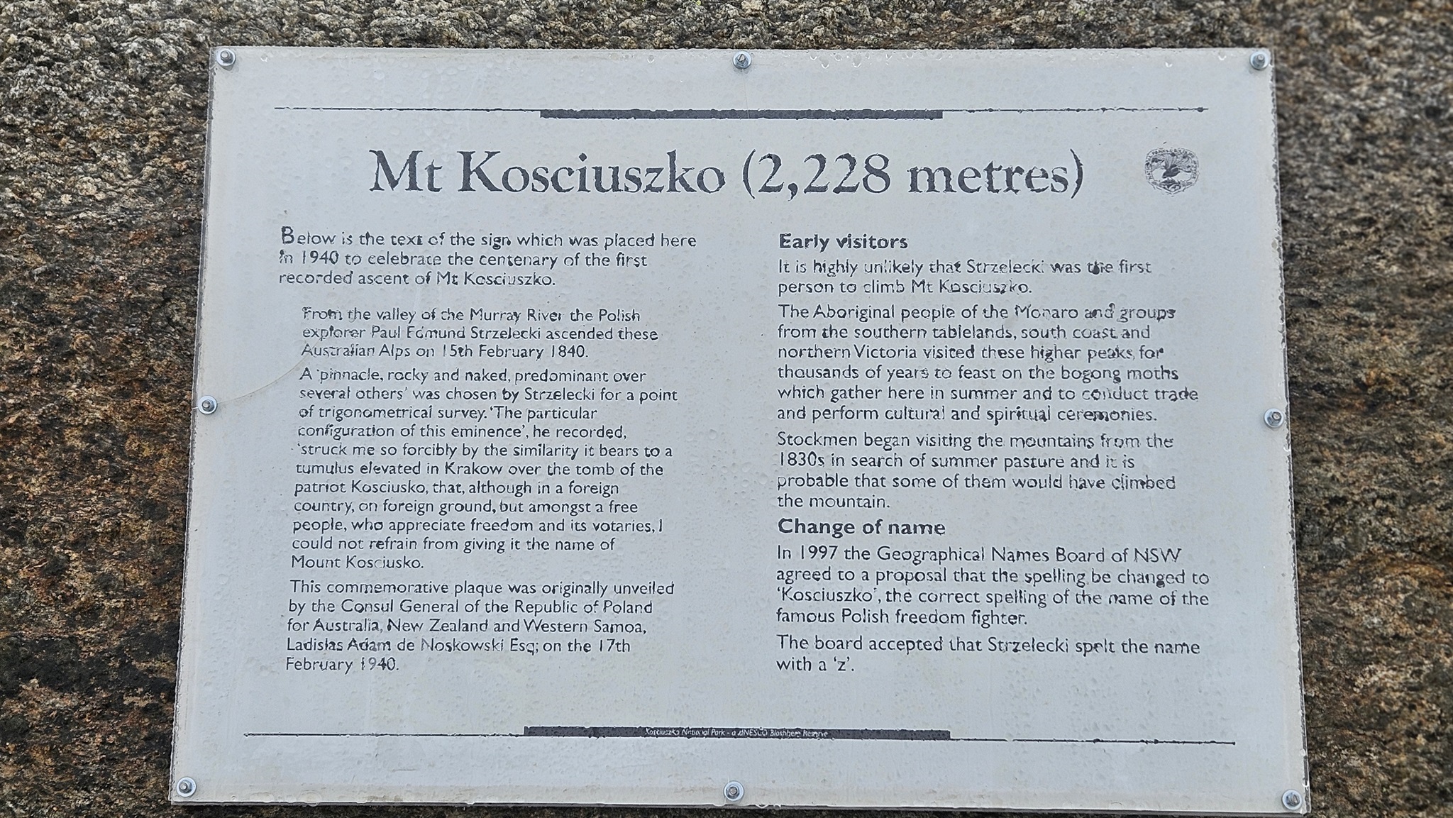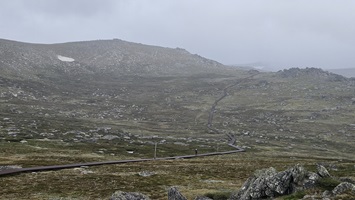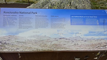 In der Früh starten wir nach Thredbo zum Nationalpark. Das Wetter ist trübe und es nieselt ganz leicht. Trotzdem machen wir uns auf den Weg mit dem Sessellift hinauf zum "Eagles Nest", wo der 13 km (hin und retour) lange Wanderweg zum höchsten Gipfel Australiens (2228m) startet. Leider wird der Regen und Nebel immer mehr und nimmt uns jegliche schöne Aussicht. Der Weg ist durchgehend auf Metallgitter geführt (um die Umwelt zu schonen) und wir können uns unsere Wanderstöcke an den Hut picken.