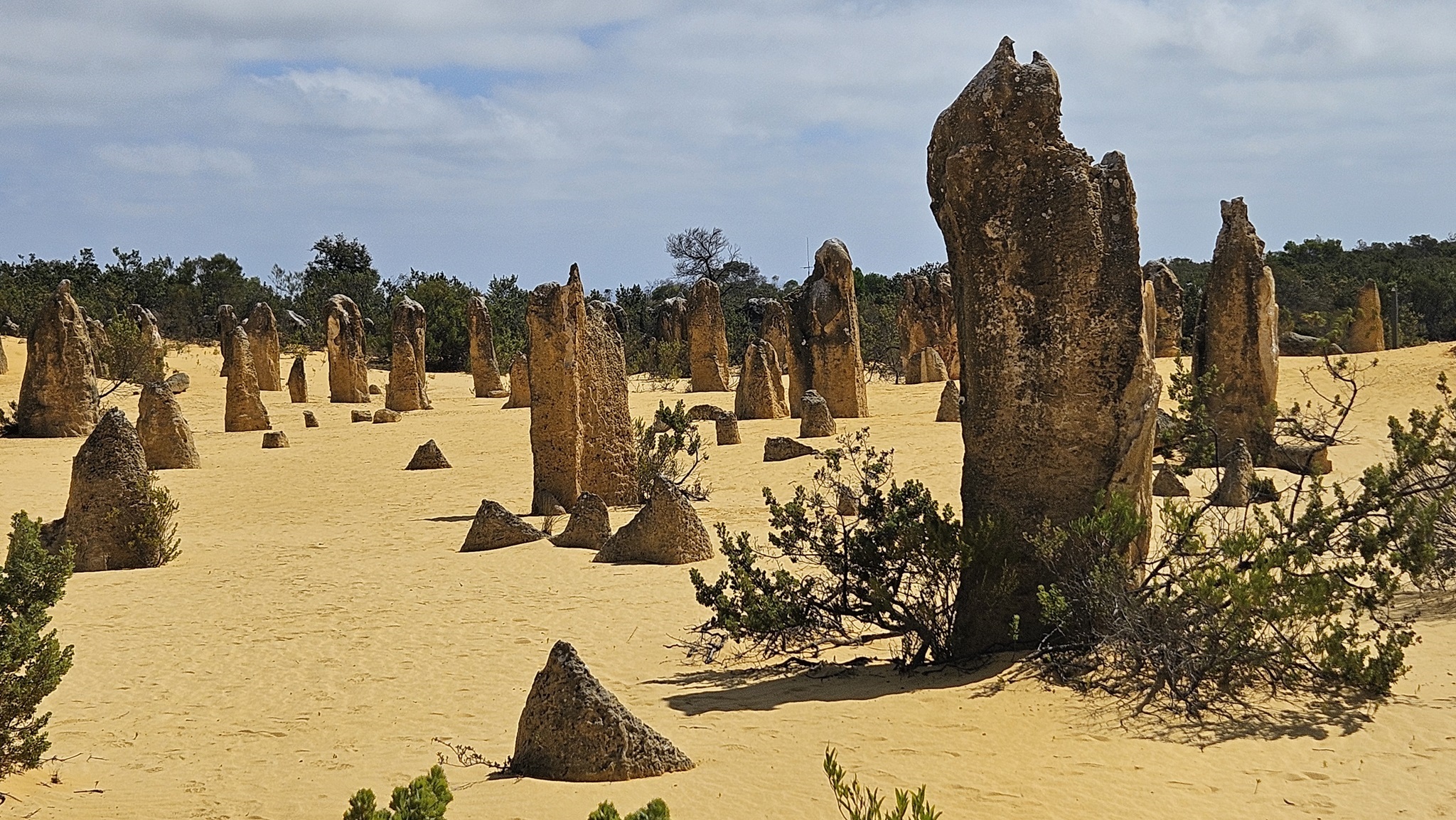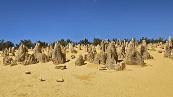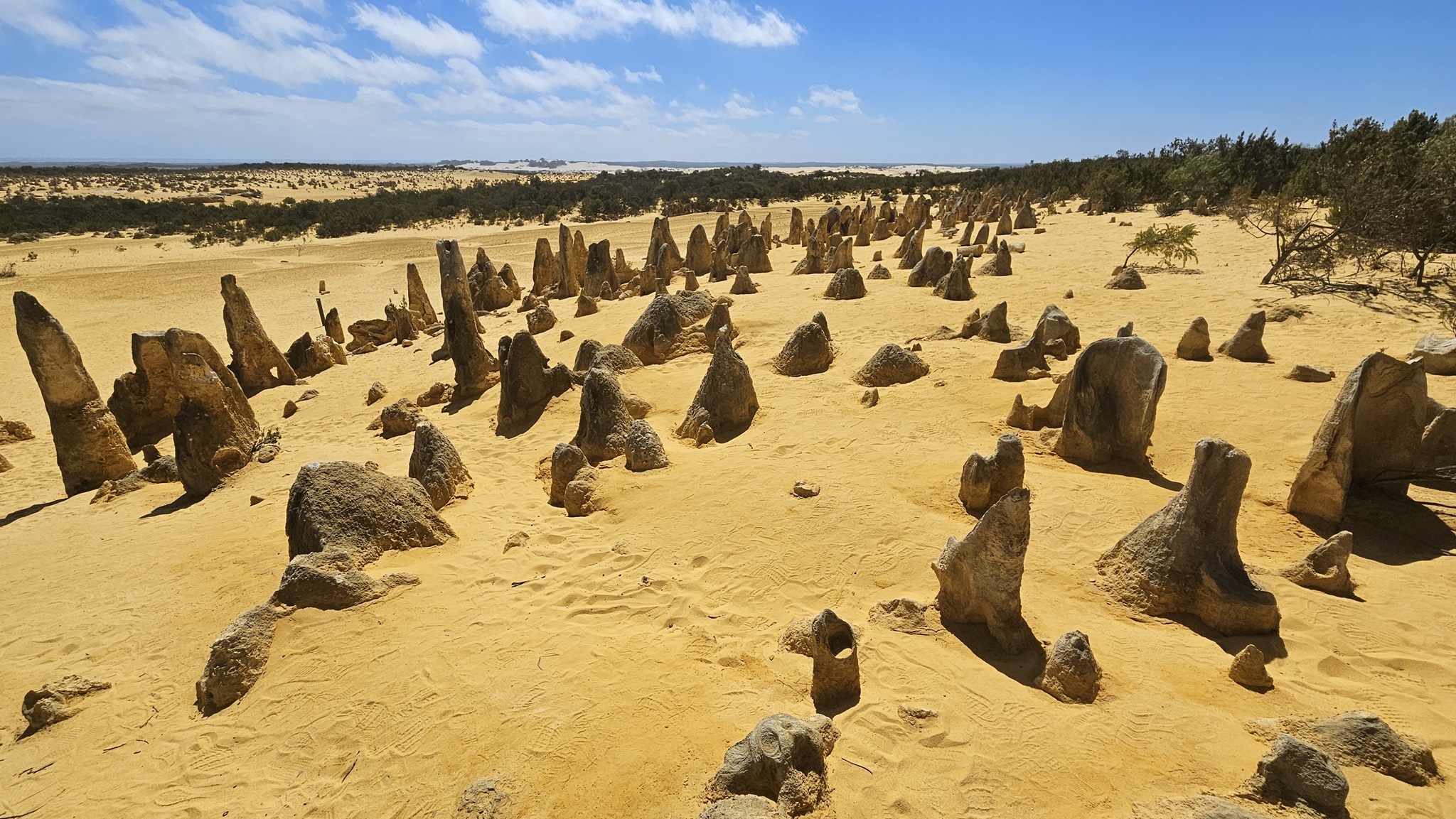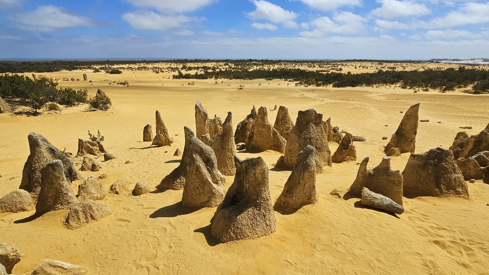 Die Pinnacles sind Kalksteinformationen im Nambung-Nationalpark in der Nähe der Stadt Cervantes. Das Gebiet ist von Tausenden verwitterter gelber Kalksteinsäulen geprägt . Einige der höchsten Felsnadeln ragen bis zu 3,5 Meter über den gelben Sandboden hinaus. Die verschiedenen Formationen umfassen solche, die deutlich höher als breit sind und Säulen ähneln, daher der Name „Felsnadeln“ , während andere nur etwa einen Meter hoch und breit sind und kleinen Grabsteinen gleichen.