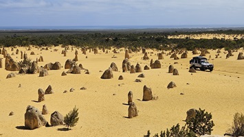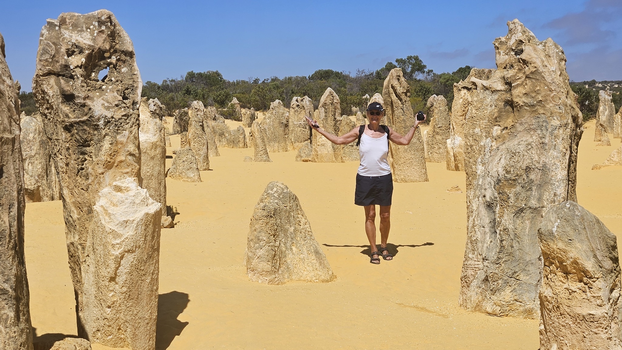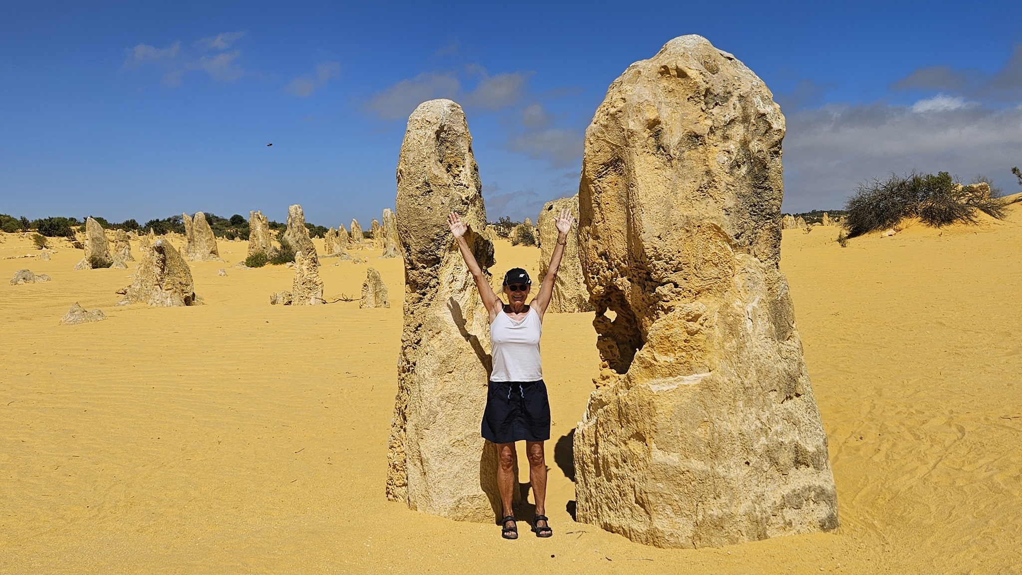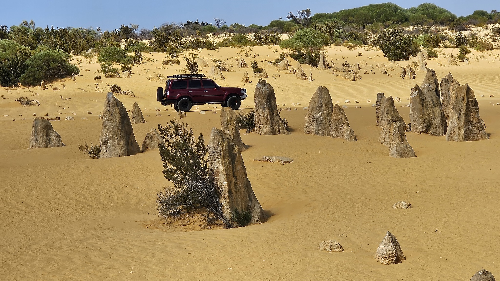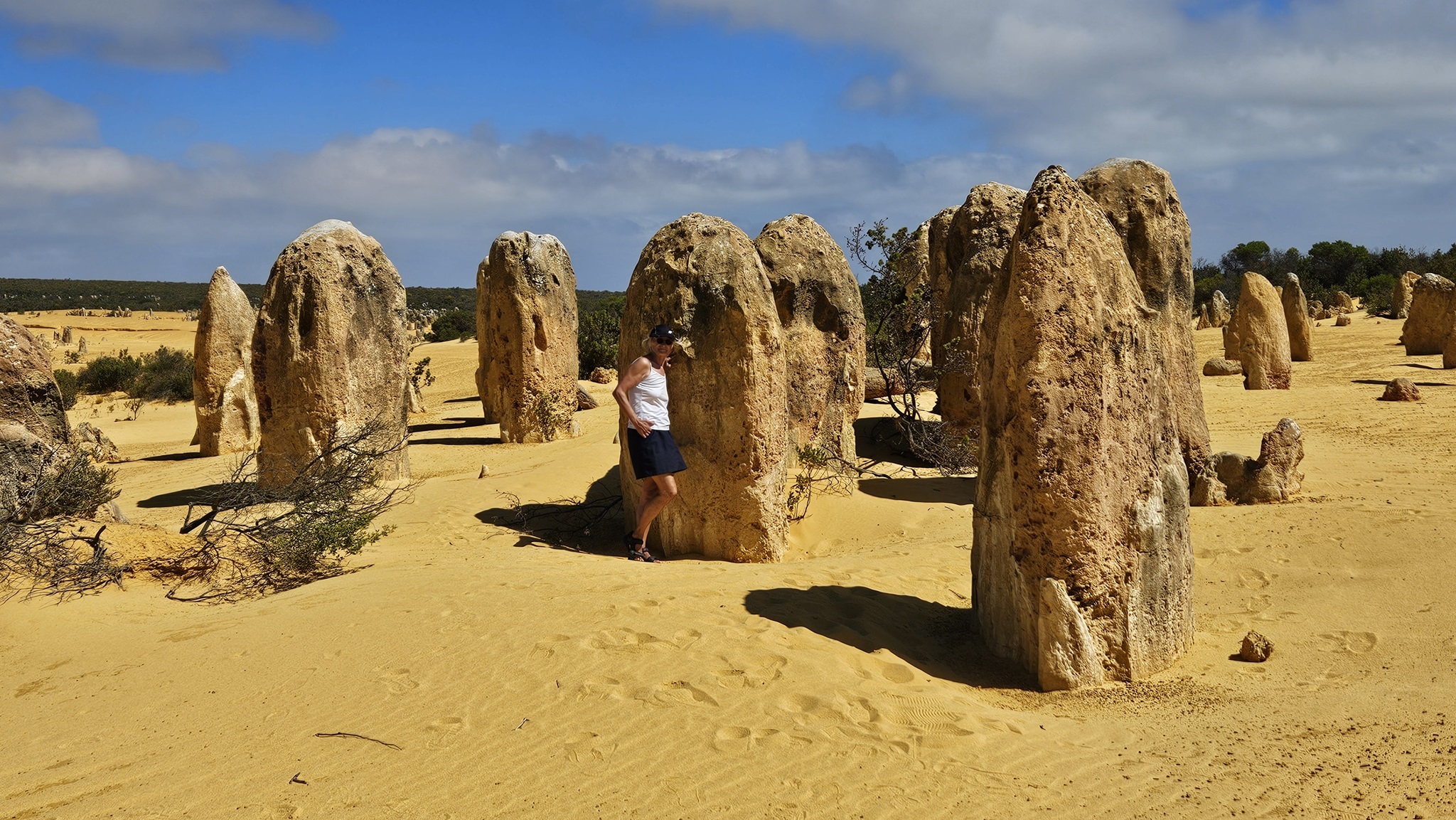 Die Pinnacles sind Kalksteinformationen im Nambung-Nationalpark in der Nähe der Stadt Cervantes. Das Gebiet ist von Tausenden verwitterter gelber Kalksteinsäulen geprägt . Einige der höchsten Felsnadeln ragen bis zu 3,5 Meter über den gelben Sandboden hinaus. Die verschiedenen Formationen umfassen solche, die deutlich höher als breit sind und Säulen ähneln, daher der Name „Felsnadeln“ , während andere nur etwa einen Meter hoch und breit sind und kleinen Grabsteinen gleichen.