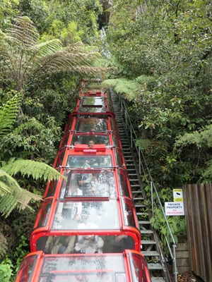 Das Railway-Erlebnis führt 310 Meter durch einen Tunnel an der Klippe hinab und taucht in den uralten Regenwald am Boden des Jamison Valley auf. Sie ist die steilste Zugseilbahn der Welt mit 52°.