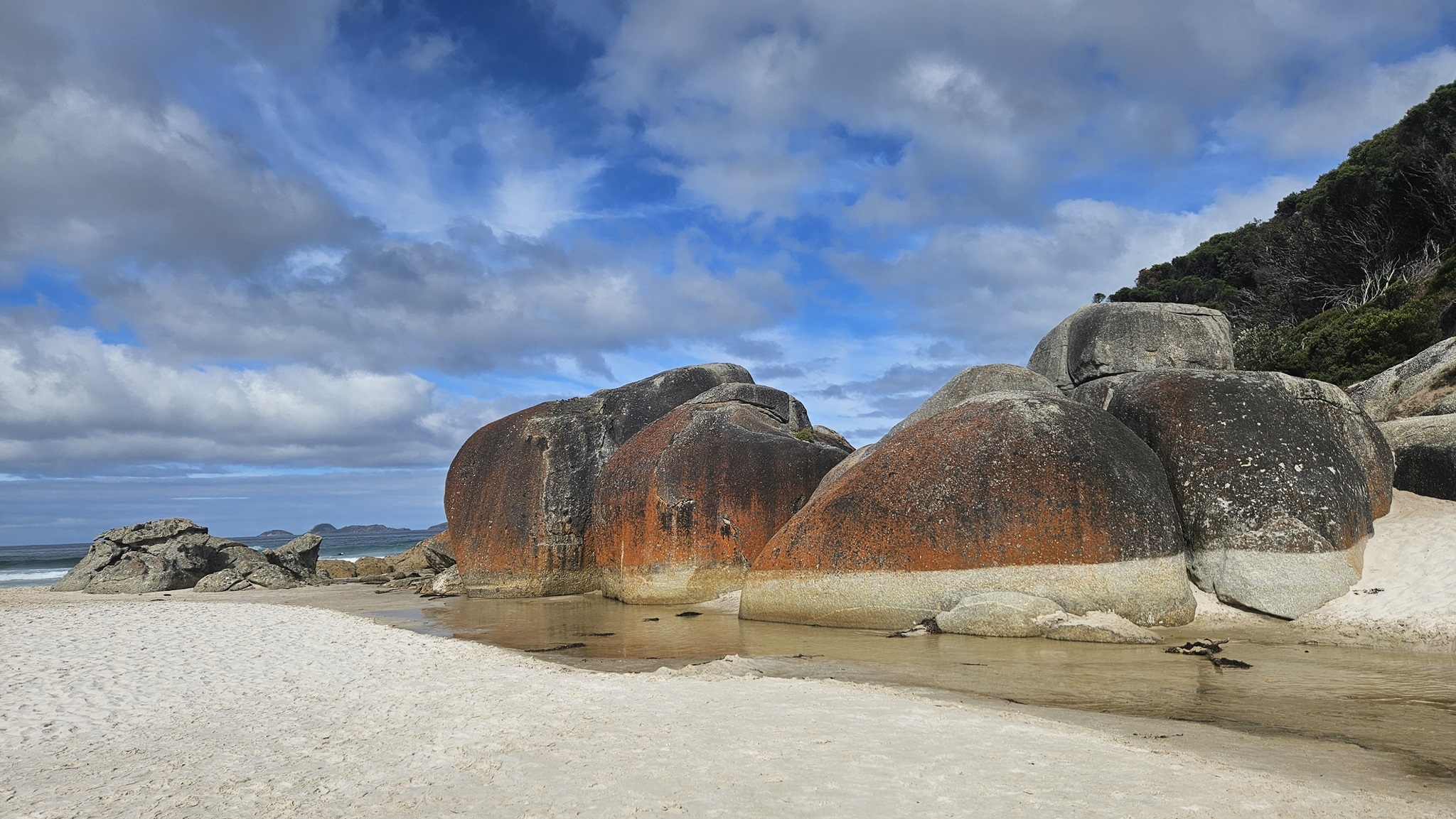 Zuerst biegen wir zum Squeaky Beach ab. Squeaky Beach ist berühmt für seinen strahlend weißen, abgerundeten Quarzsand, der beim Begehen ein charakteristisches quietschendes Geräusch erzeugt. Bekannt für sein türkisfarbenes Wasser, seine großen Granitfelsen und seine atemberaubende Landschaft.